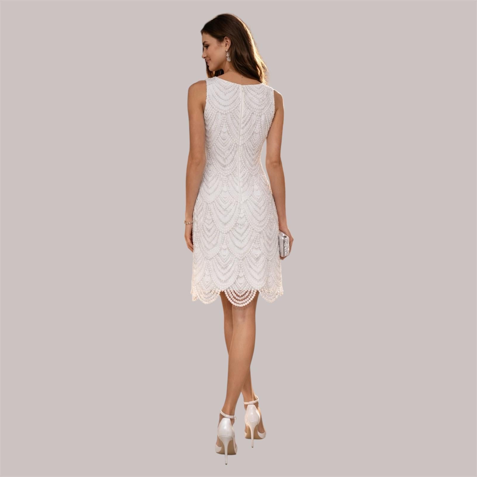 The dress in the image is a sleeveless, knee-length, white dress. It features intricate beaded or embellished patterns arranged in elegant, cascading arcs, creating a luxurious, vintage-inspired look, reminiscent of 1920s flapper style. The hemline has a scalloped edge that follows the beaded pattern, adding to the ornate and delicate appearance. The overall silhouette is straight and slightly fitted, offering a classic and sophisticated style. Available in white.