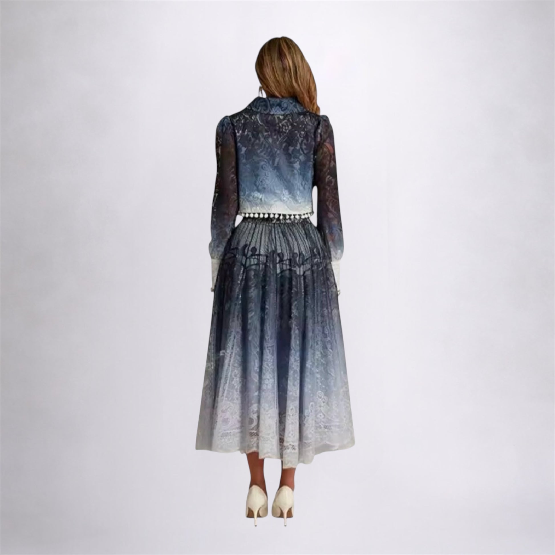 • The fabric features an intricate lace or damask-style pattern, with a beautiful ombré effect transitioning from navy at the waist to white at the hem.