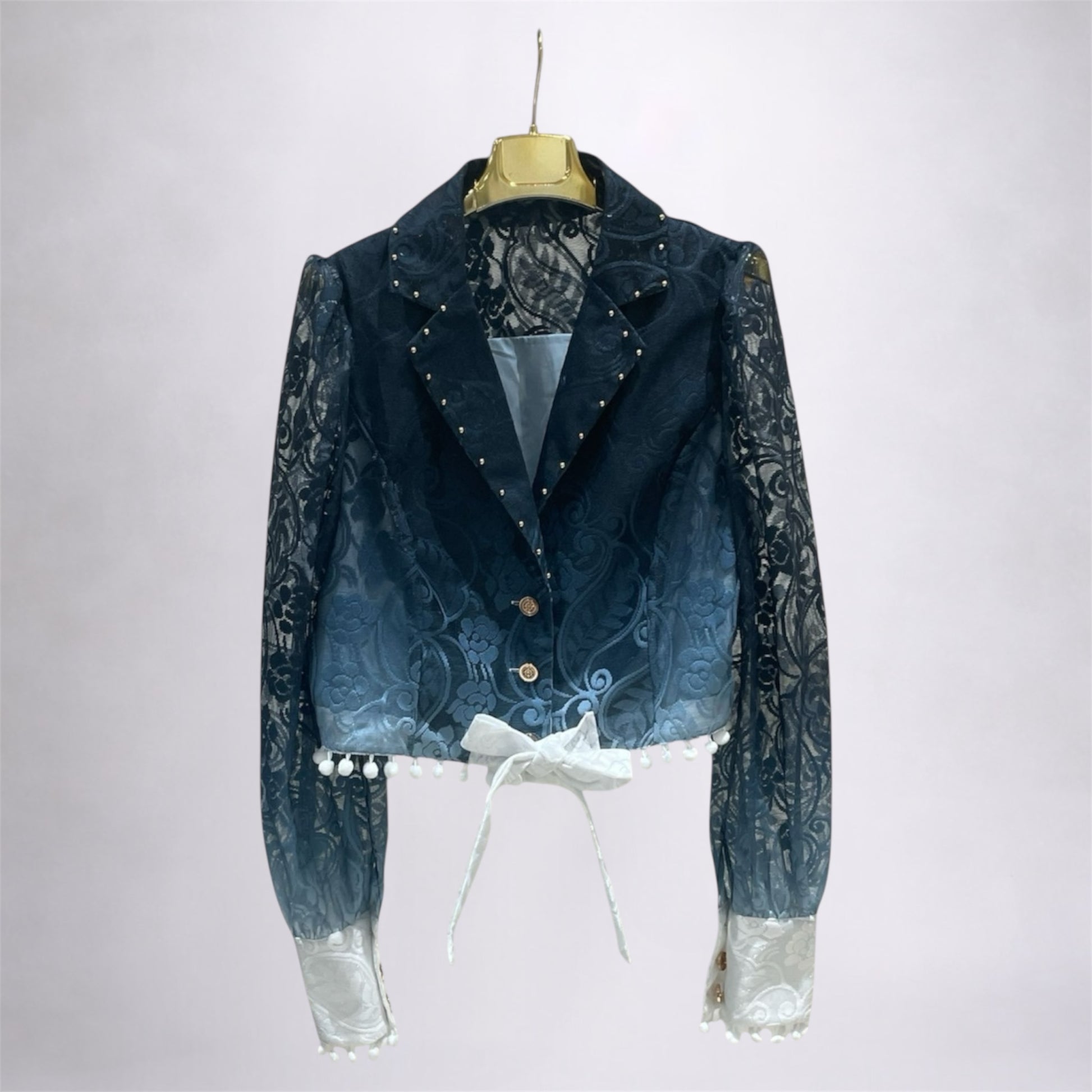 • The blouse has long sheer sleeves with a dark-to-light gradient, starting from deep navy at the shoulders and fading to white at the cuffs.
